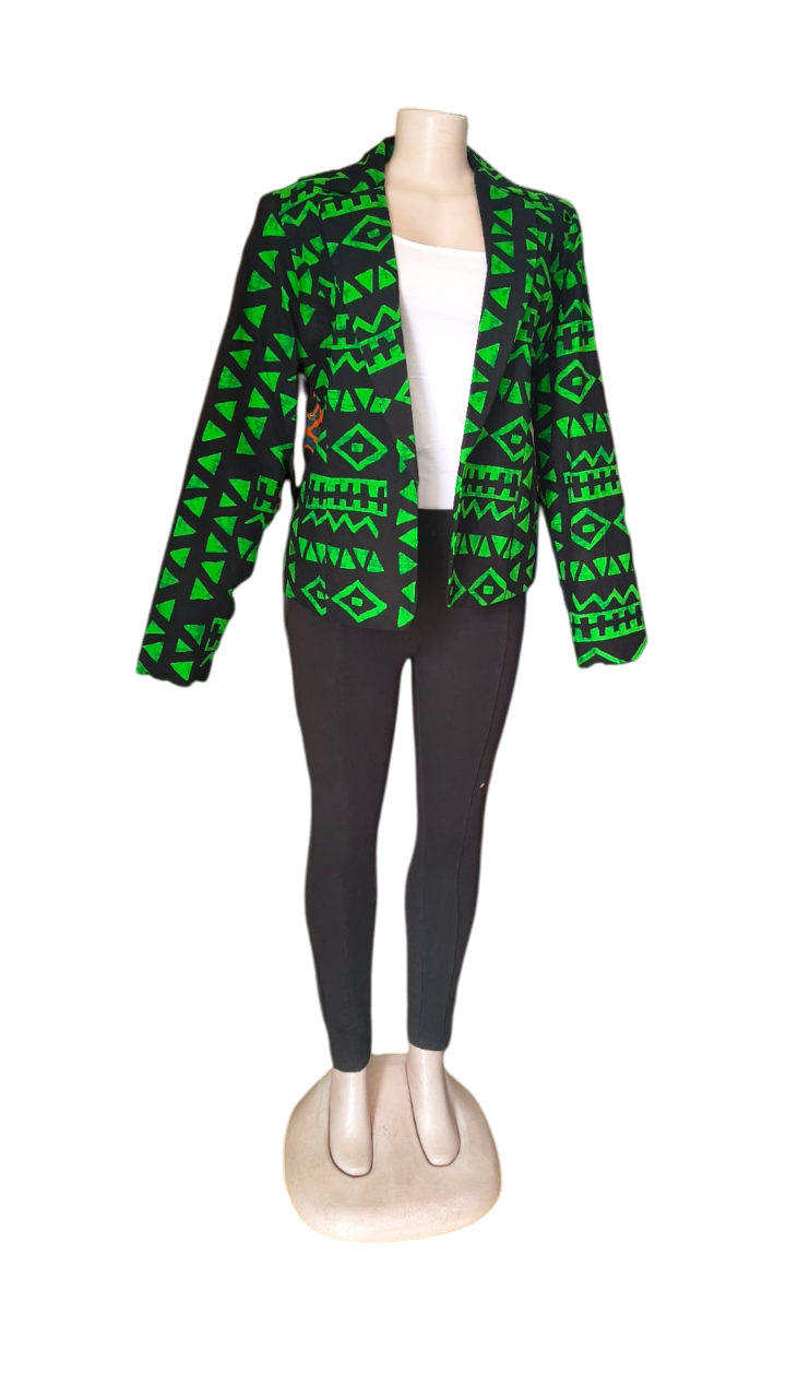 This isn’t your average blazer. Crafted from luxurious Ankara fabric, this bold piece features a striking neon green and black geometric print that demands attention. The classic blazer silhouette gets a modern upgrade with this eye-catching design, perfect for adding a touch of African flair to your professional or weekend wardrobe. Pair it with jeans and sneakers for a casual look, or dress it up with tailored trousers for a sophisticated ensemble. Be bold, be you, be unforgettable.